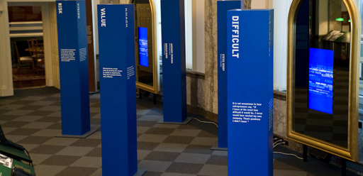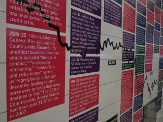 Presented as a monumental 8’ x 20’ graphical wall accompanied by a video presentation, the timeline begins with the bursting of the U.S. housing bubble in late 2006 through the unprecedented trillions being guaranteed and injected into the private sector in 2008-2009 by the government. President Barack Obama’s stimulus package of almost $800 billion is part of the stabilization effort to forestall a financial collapse, in a global environment in which some $40 trillion in wealth has been lost (on paper) in the last 18 months. The U.S. government’s actions represent a watershed in American economic and political history.
